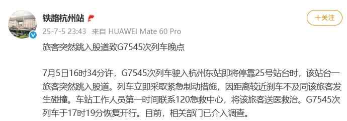 据@铁路杭州站 消息,7月5日16时34分许,G7545次列车驶入杭州东站即将停靠25号站台时,该站台一旅客突然跳入股道。列车立即采取紧急制动措施,因距离较近刹车不及同该旅客发生碰撞。车站工作人员第一时间联系120急救中心,将该旅客送医救治。G7545次列车于17时19分恢复开行。目前,相关部门已介入调查。