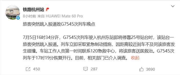 @铁路杭州站 微博消息,7月5日16时34分许,G7545次列车驶入杭州东站即将停靠25号站台时,该站台一旅客突然跳入股道。列车立即采取紧急制动措施,因距离较近刹车不及同该旅客发生碰撞。车站工作人员第一时间联系120急救中心,将该旅客送医救治。G7545次列车于17时19分恢复开行。目前,相关部门已介入调查。