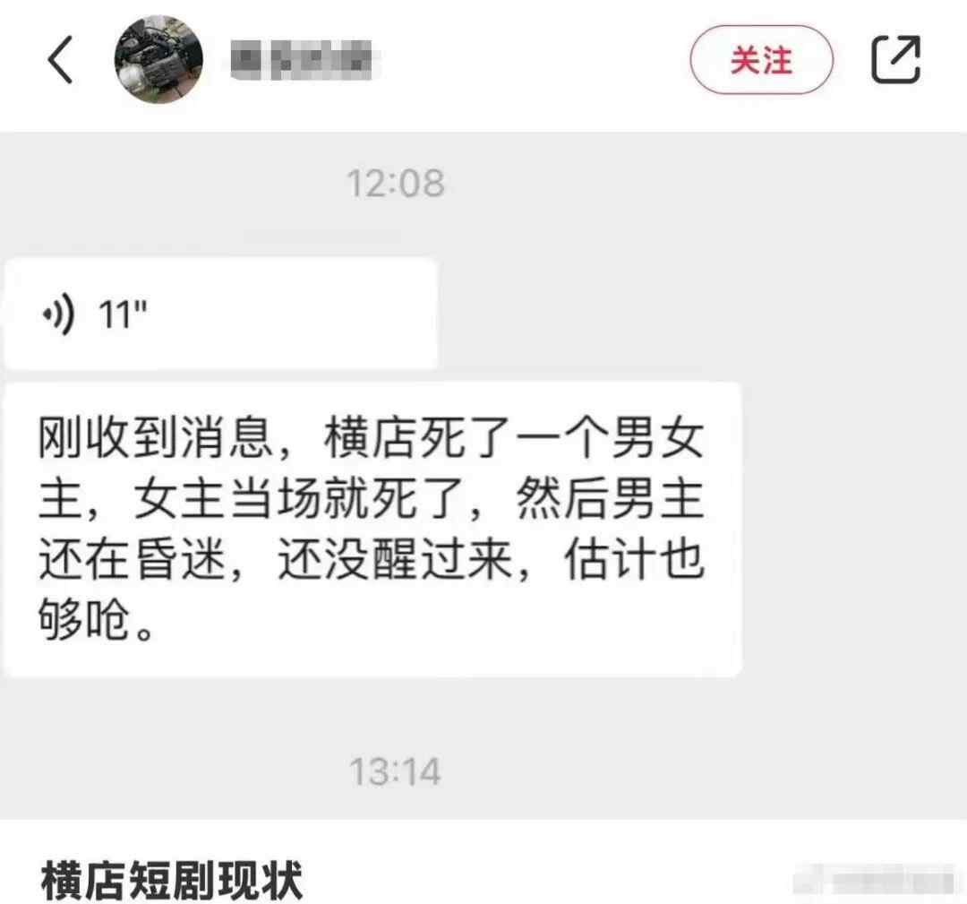 记者随后致电短剧行业从业者,一位短剧导演告诉记者,他在朋友圈看到过这个消息,和网络上发布的图片内容一致,消息称女演员当时正在拍摄古装短剧,“但是没有确切的消息来源,不知真假。”随后,记者致电一位常驻横店的男演员,对方回复与上述人员相同,“都不确定消息真实性。”