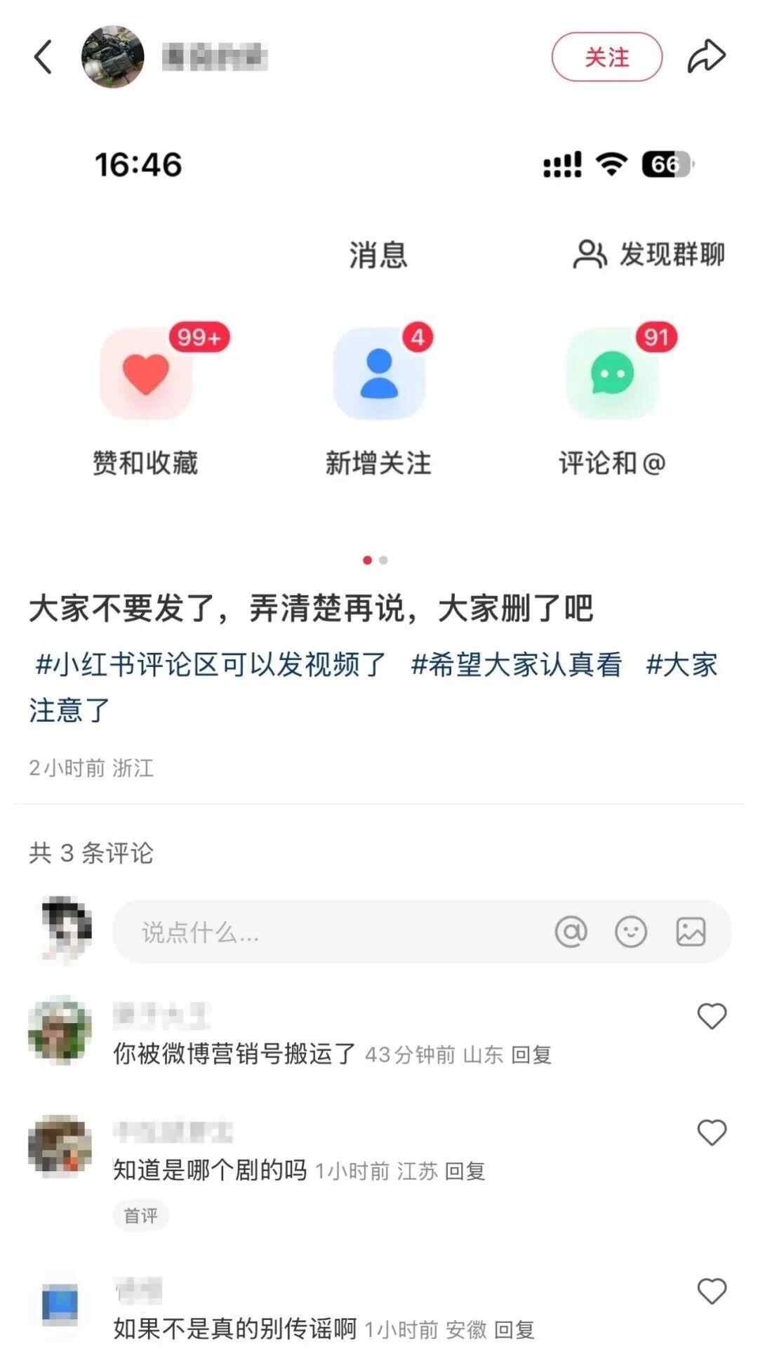 当天下午5点,小红书网友“善良的梁”发文称:大家不要发了,弄清楚再说,大家删了吧。配图为有大量评论和点赞的消息截图。其IP地址显示为浙江,头像、网名与上述微博截图一致。
