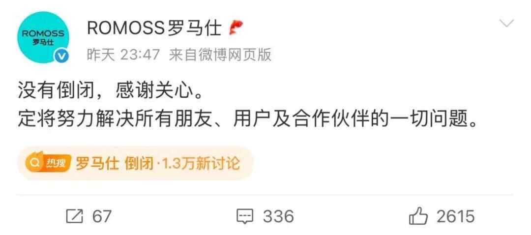 7月3日晚,罗马仕官方微博发文称:没有倒闭,感谢关心。定将努力解决所有朋友、用户及合作伙伴的一切问题。