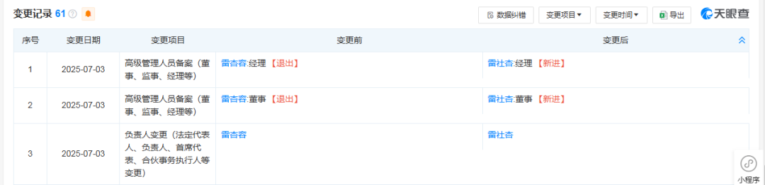 天眼查APP显示,深圳罗马仕科技有限公司近日发生工商变更,雷杏容卸任法定代表人、董事、经理,由雷社杏接任。该公司成立于2012年3月,注册资本600万元。