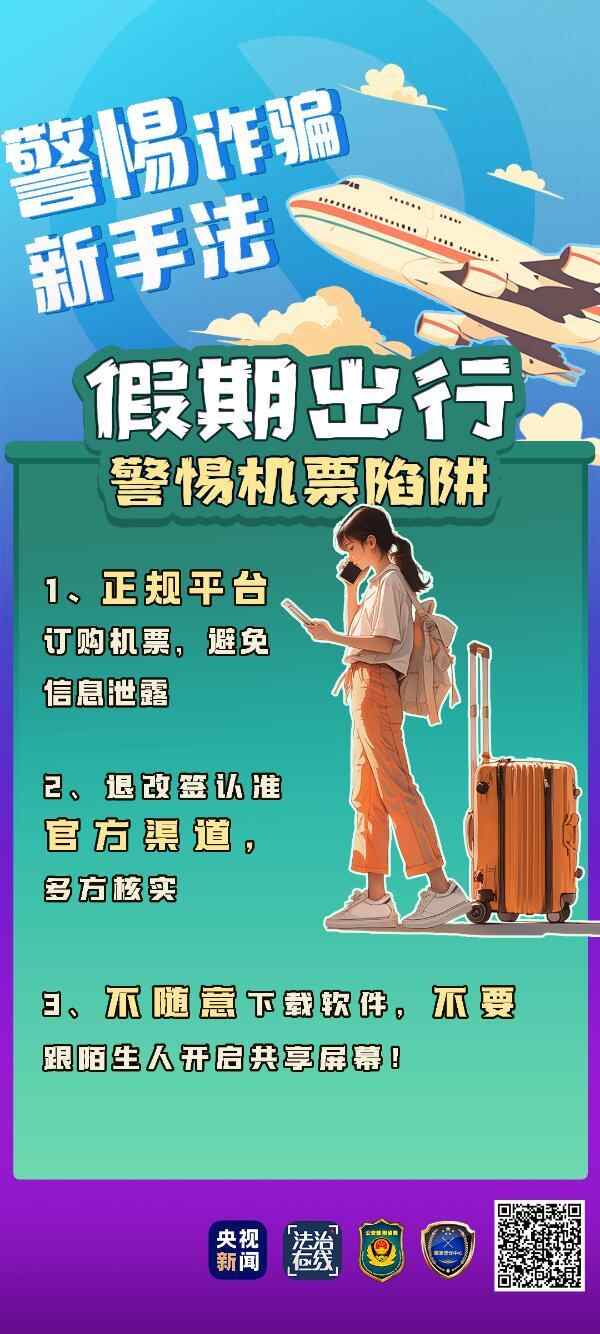 除“机票退改签”类骗局,广大旅客在购票环节也要提高警惕,拒绝各种非正规购票渠道“超低折扣”机票陷阱,防范“财票两空”,影响出行。