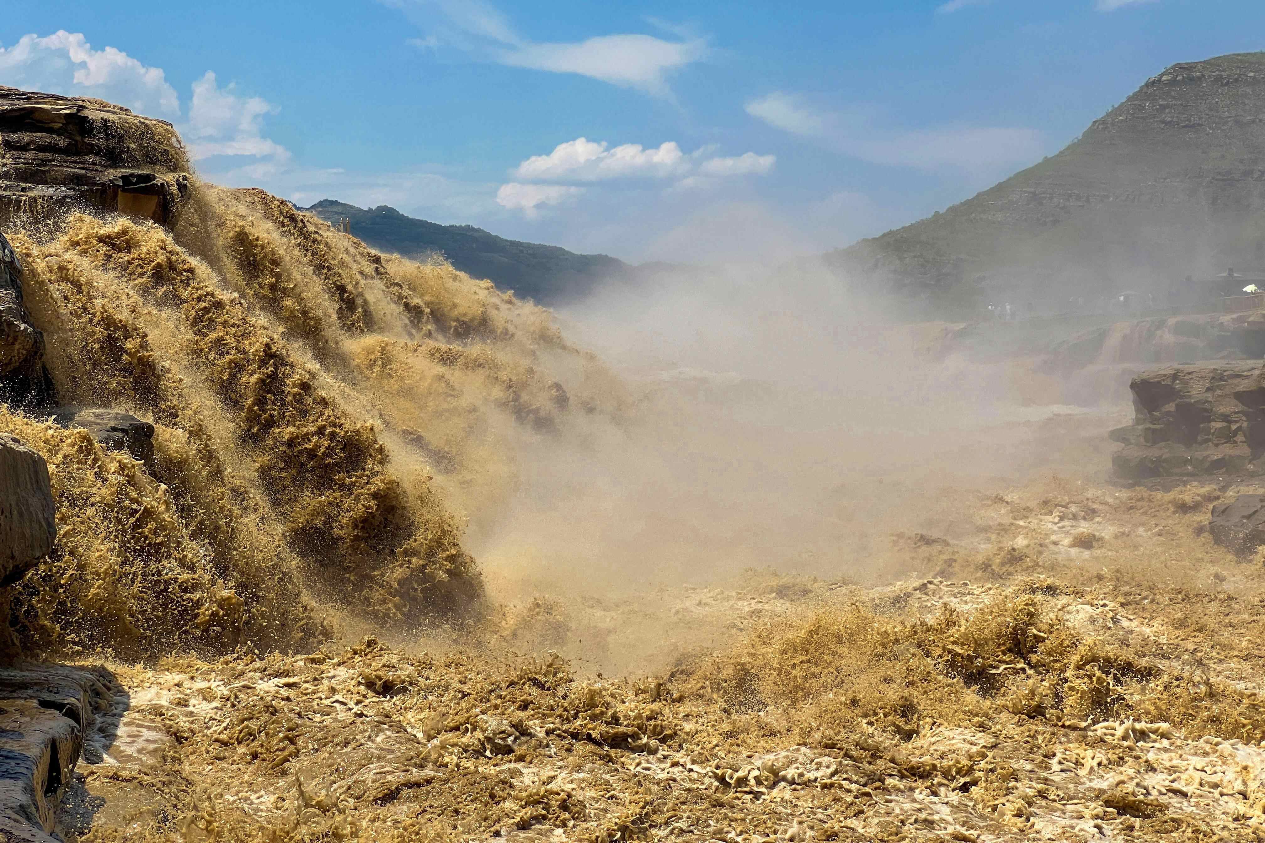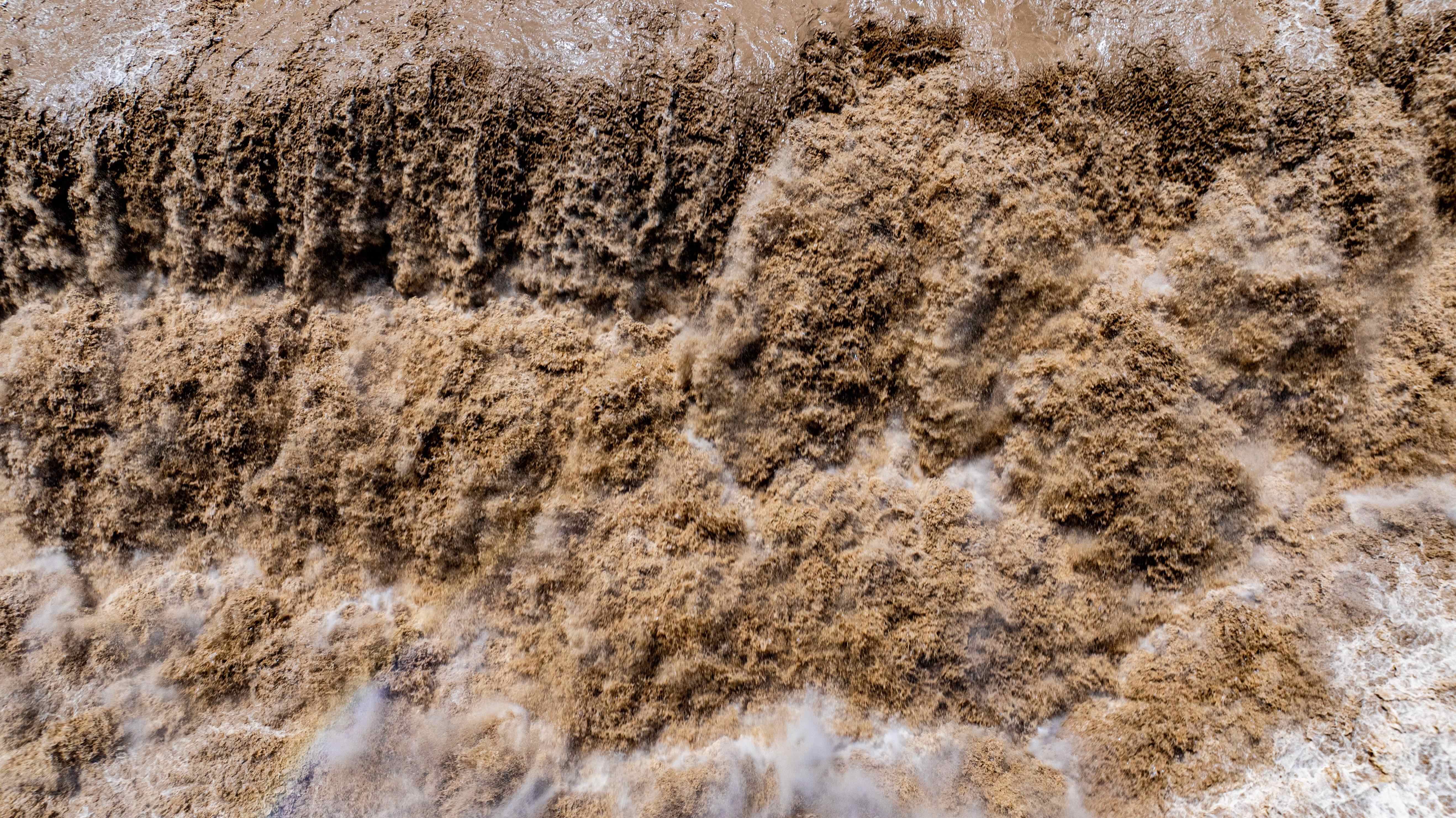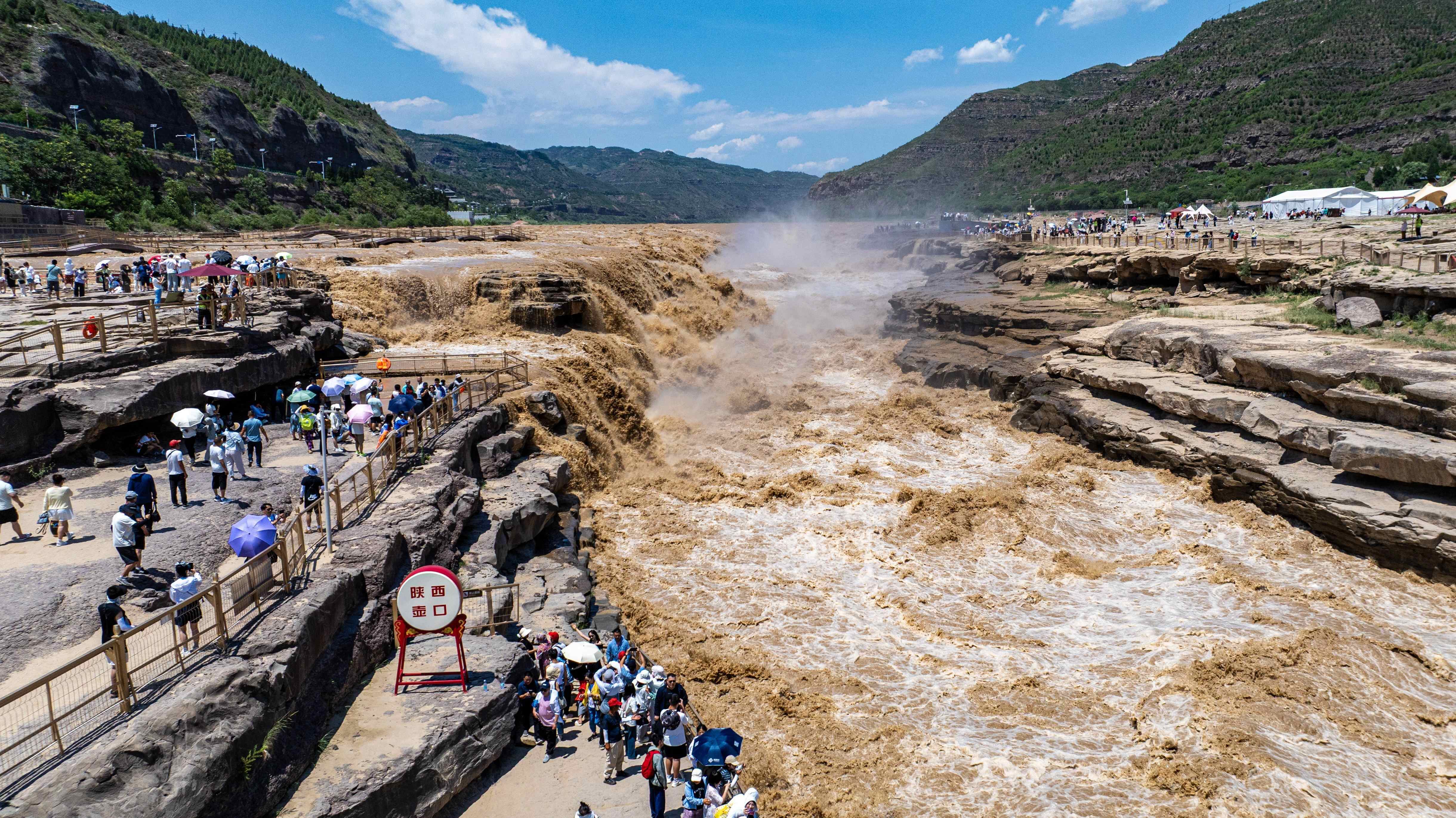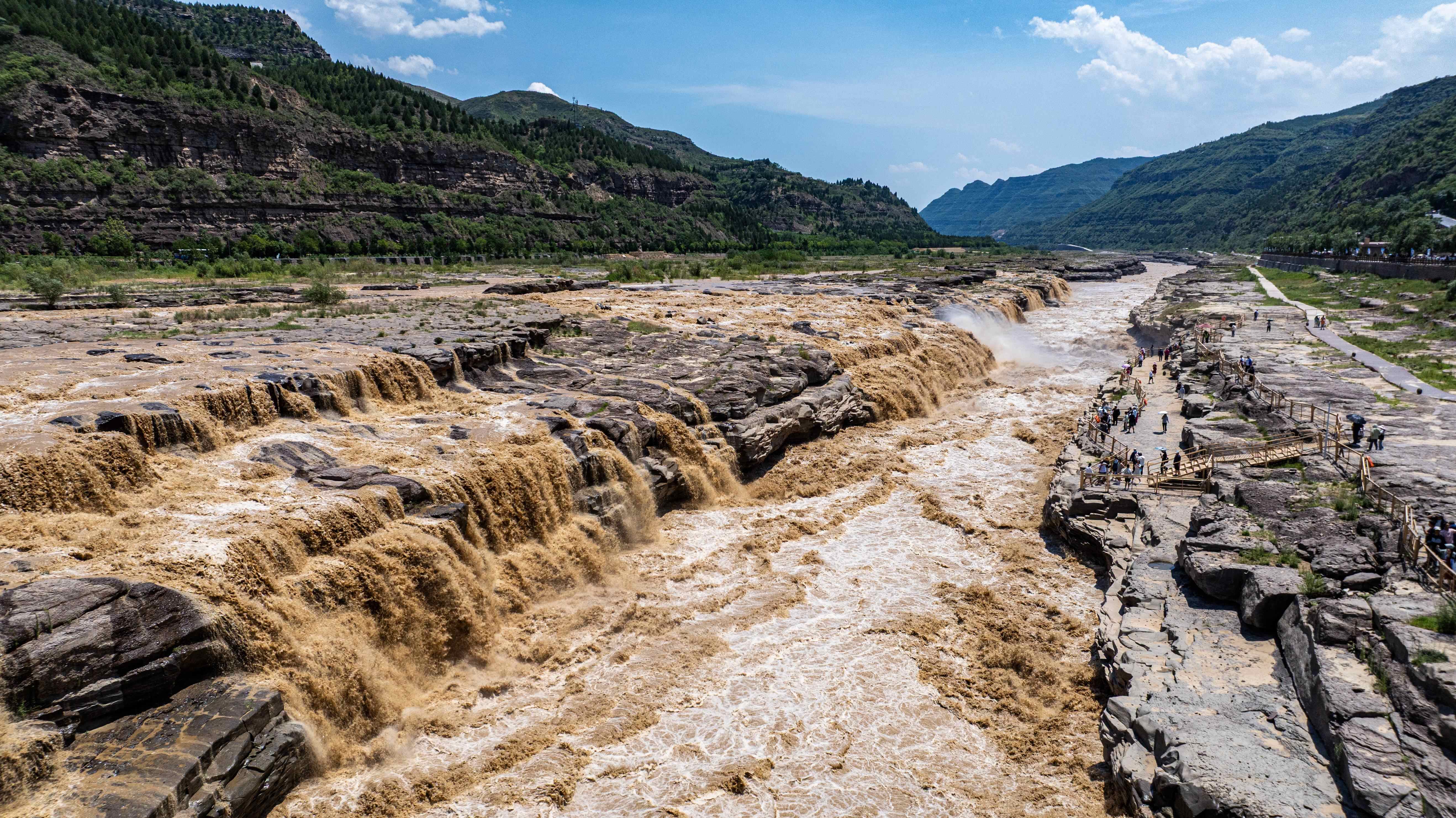从空中俯瞰,奔腾的河水如同脱缰之马,呼啸而下,主副瀑布携手倾泻,再现壮美金黄色瀑布群,出现水岸齐平、金涛拍岸的壮美景观,再现“90版50元人民币”壮阔取景瀑布,正式进入今年最佳观赏期。