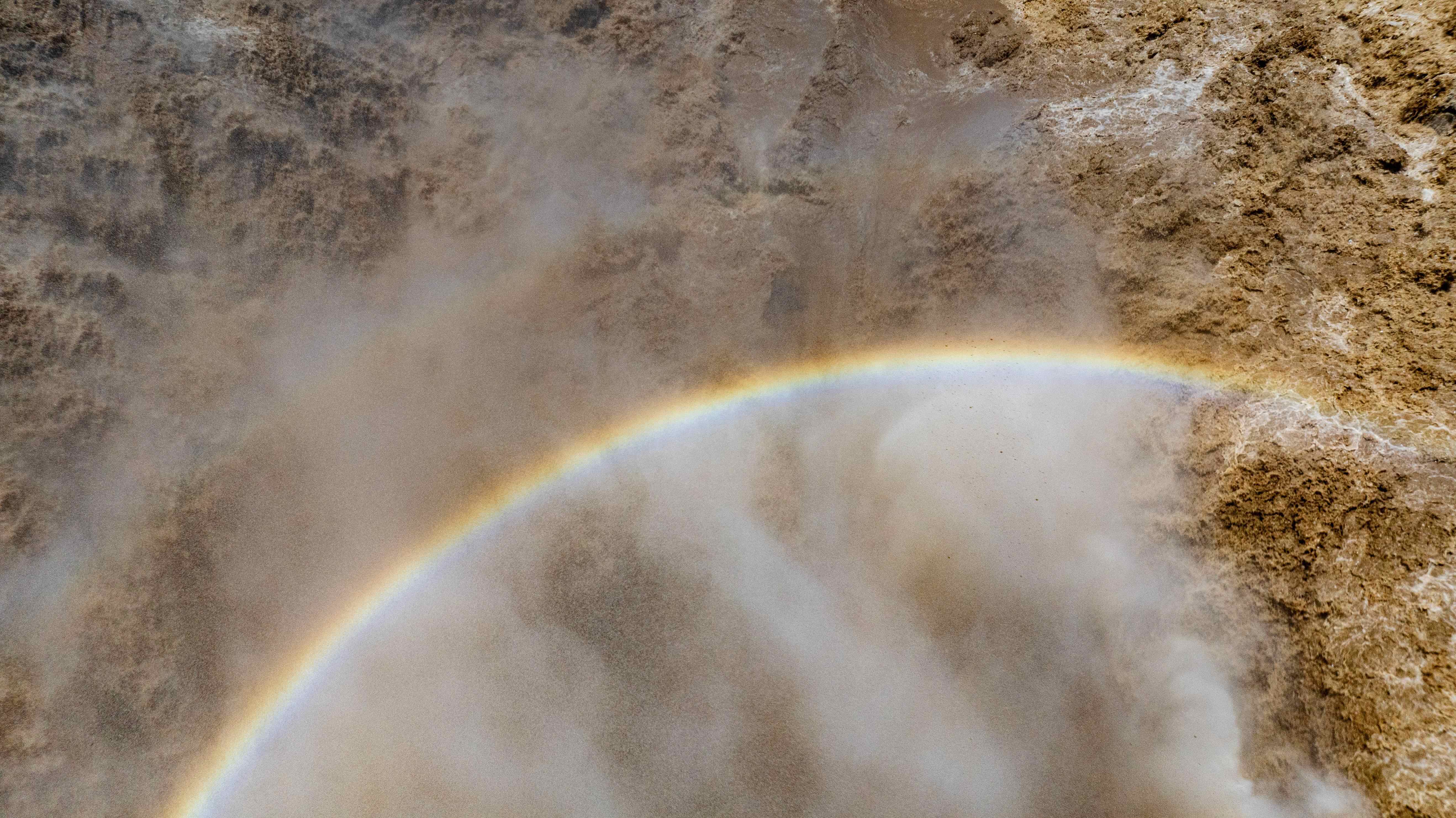 河水撞击瀑布底部岩石,飞溅的珠玉在半空凝成细密水雾,在骄阳下折射出七彩光晕,横跨于瀑布之上,以排山倒海之势撕裂苍穹,为这雄浑壮阔的景致注入磅礴气韵。