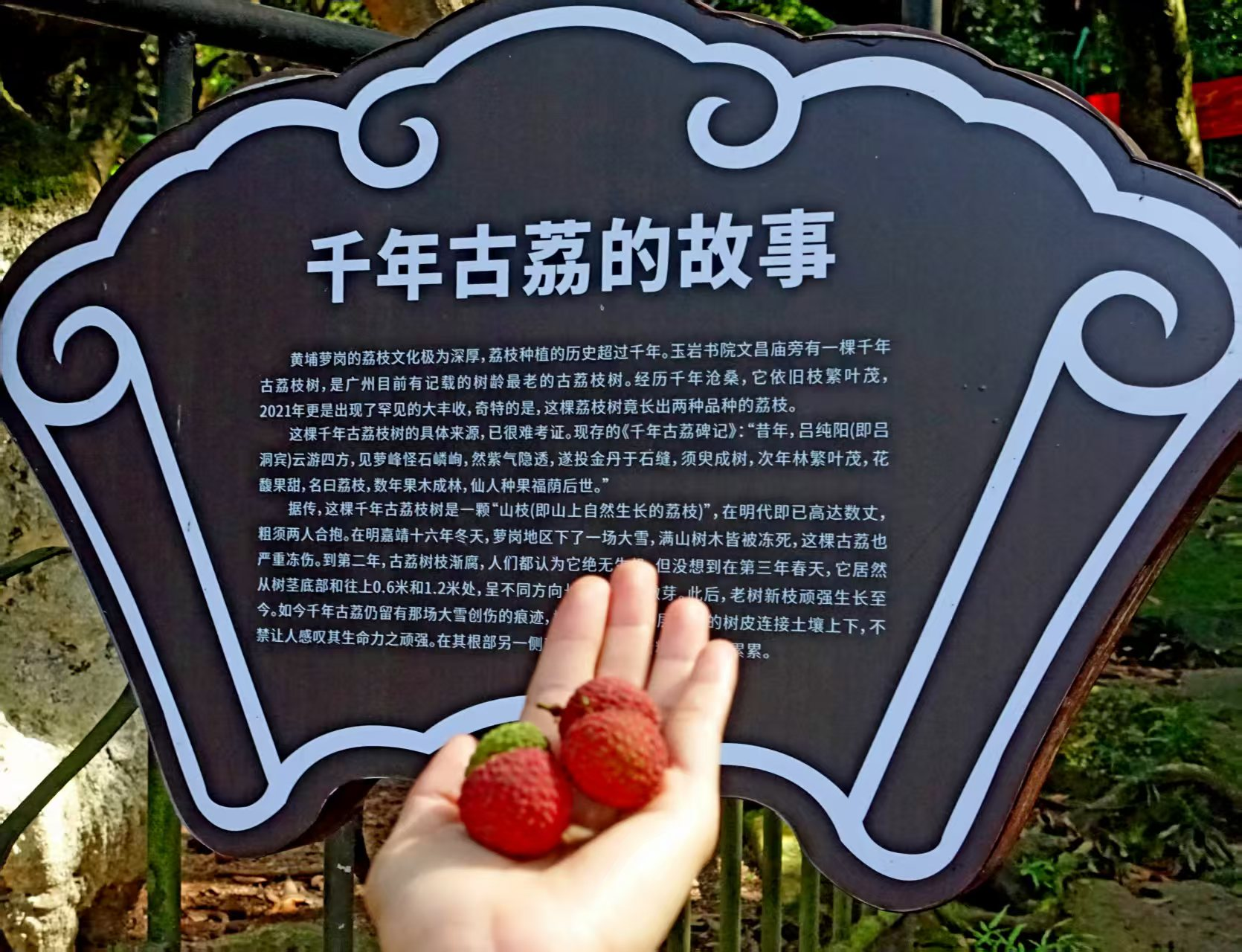 千年古荔位于广州黄埔玉岩书院,为一级古树,据估测迄今有1024岁,这个年龄对于具有2200多年悠久历史的广州来说,可谓见证了城市半部的历史,承载着市民对岭南佳果的记忆与情感。
