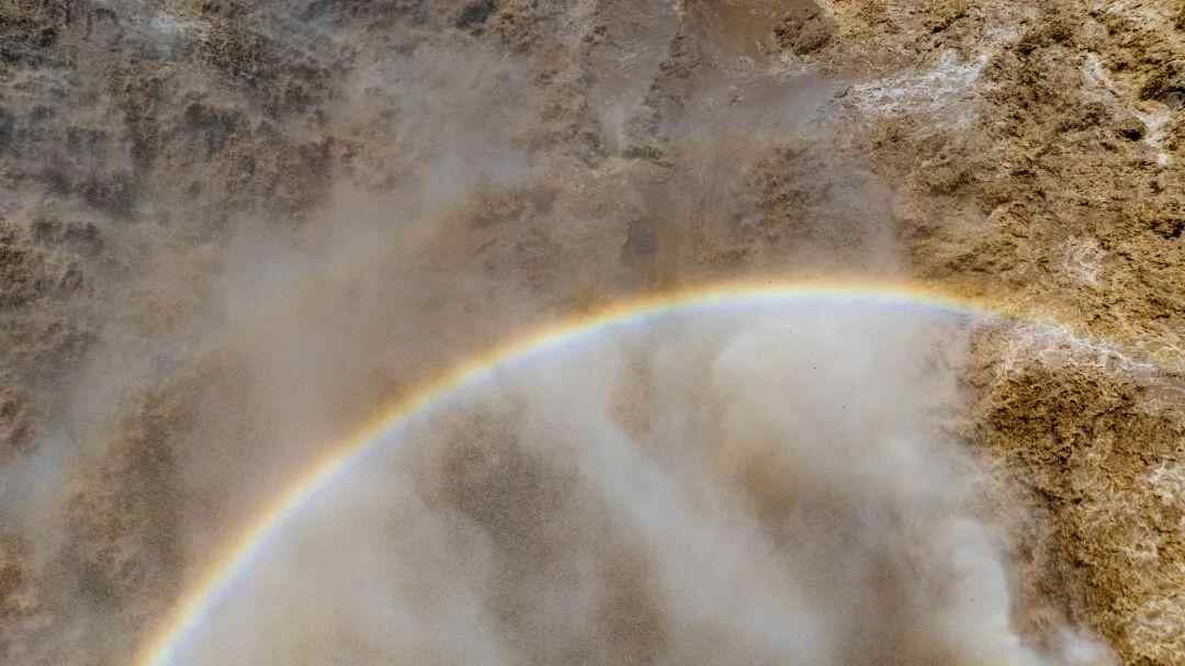 从空中俯瞰,奔腾的河水如同脱缰之马,呼啸而下,主副瀑布携手倾泻,再现壮美金黄色瀑布群,出现水岸齐平、金涛拍岸的壮美景观,再现“90版50人民币”壮阔取景瀑布,正式进入今年最佳观赏期。