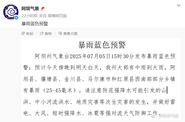 记者注意到,阿坝州气象台7月5日15时30分发布暴雨蓝色预警。