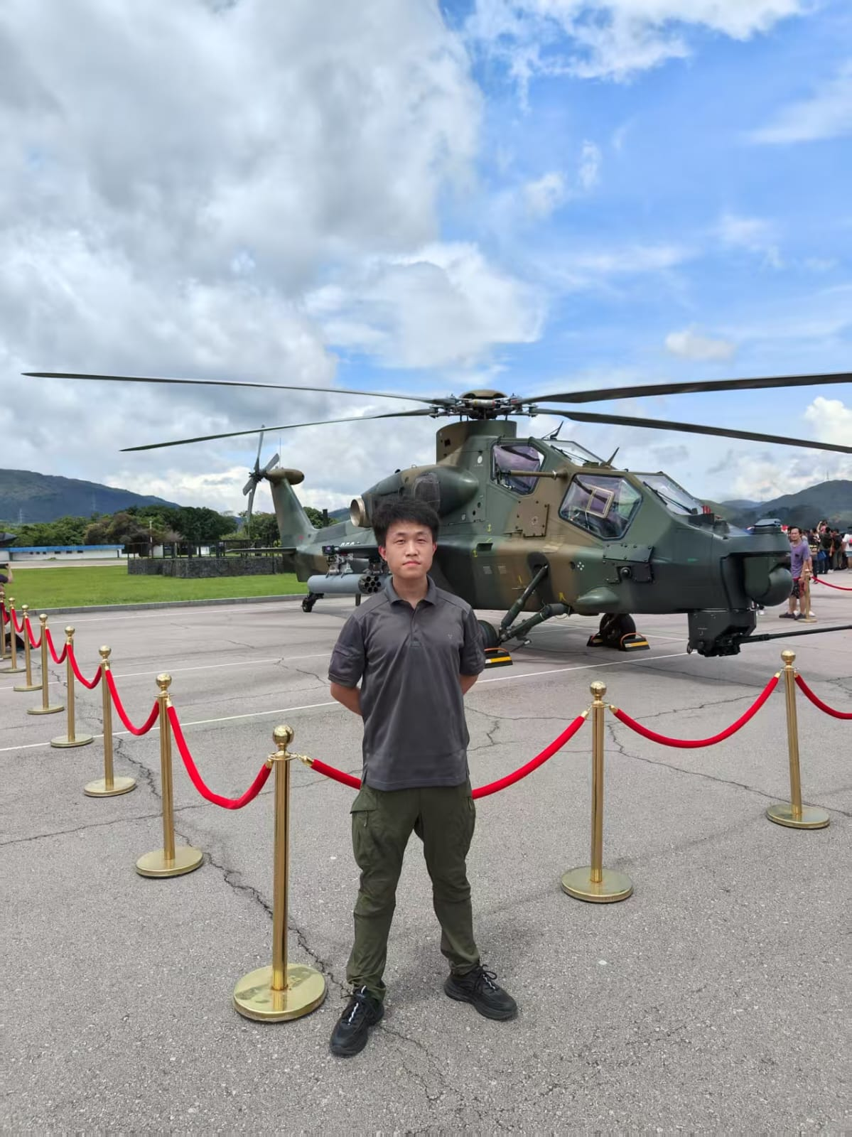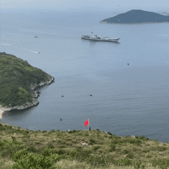 阿兵挥舞国旗,迎接山东舰航母编队访港。