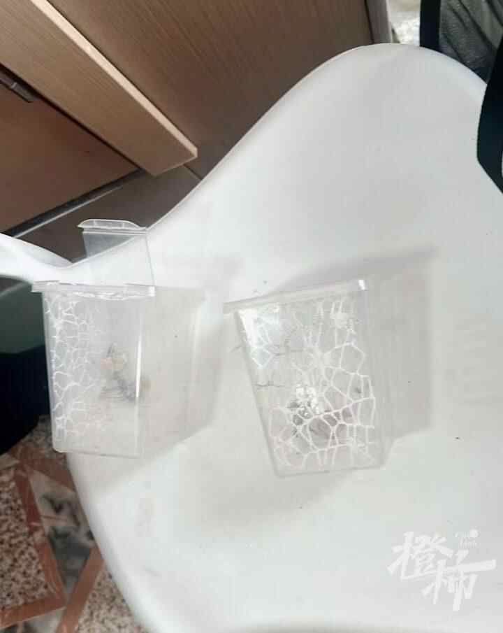 邻居小孟二十出头的年纪,因个人喜好,在家中养了两只螳螂,分别装在两个带盖子的小塑料盒中,被杀死的两只螳螂翅膀已经干瘪,外观呈浅色。