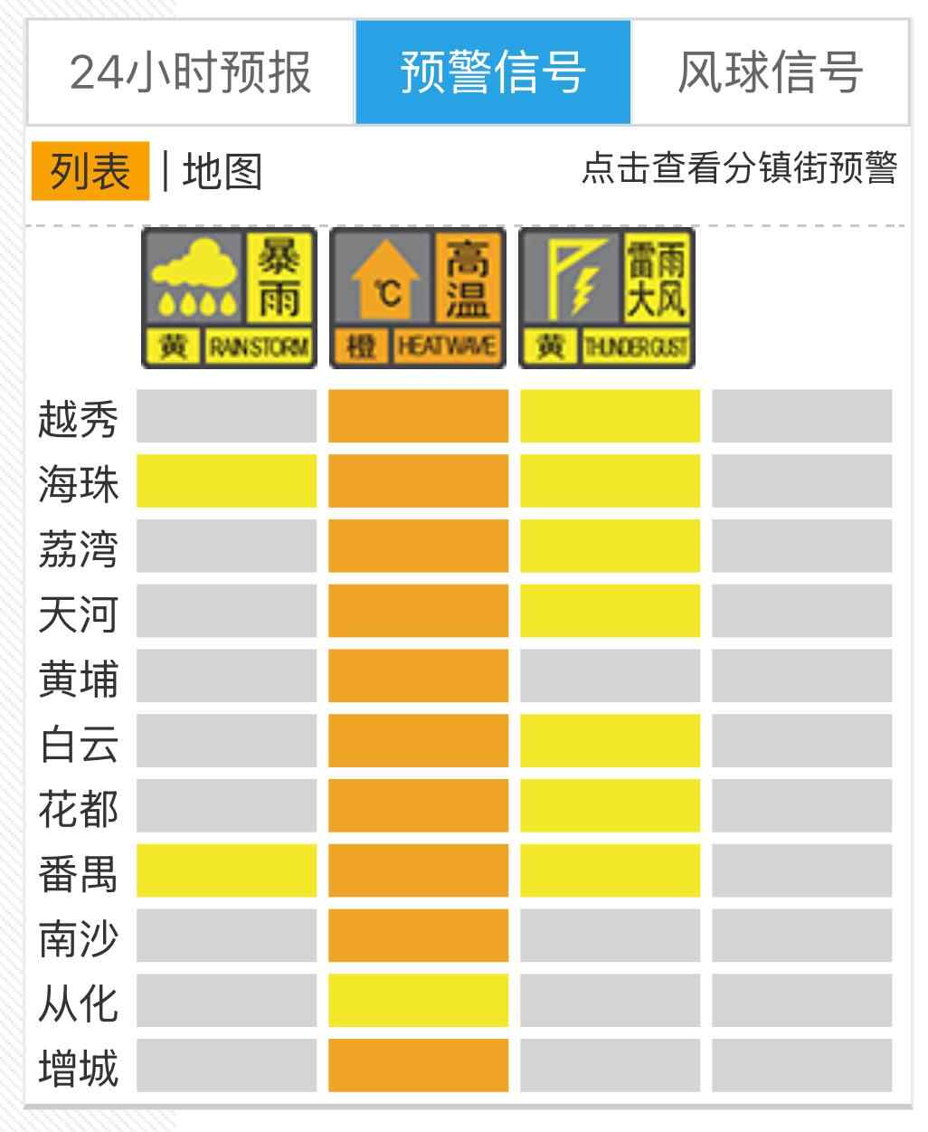 截至7月6日18时33分,越秀、海珠、荔湾、天河、白云、花都、番禺,发布雷雨大风黄色预警信号。海珠、番禺,发布暴雨黄色预警信号。广州所有行政区,维持发布高温黄色或以上级别预警信号,除从化区外其余各区维持发布高温橙色预警信号。