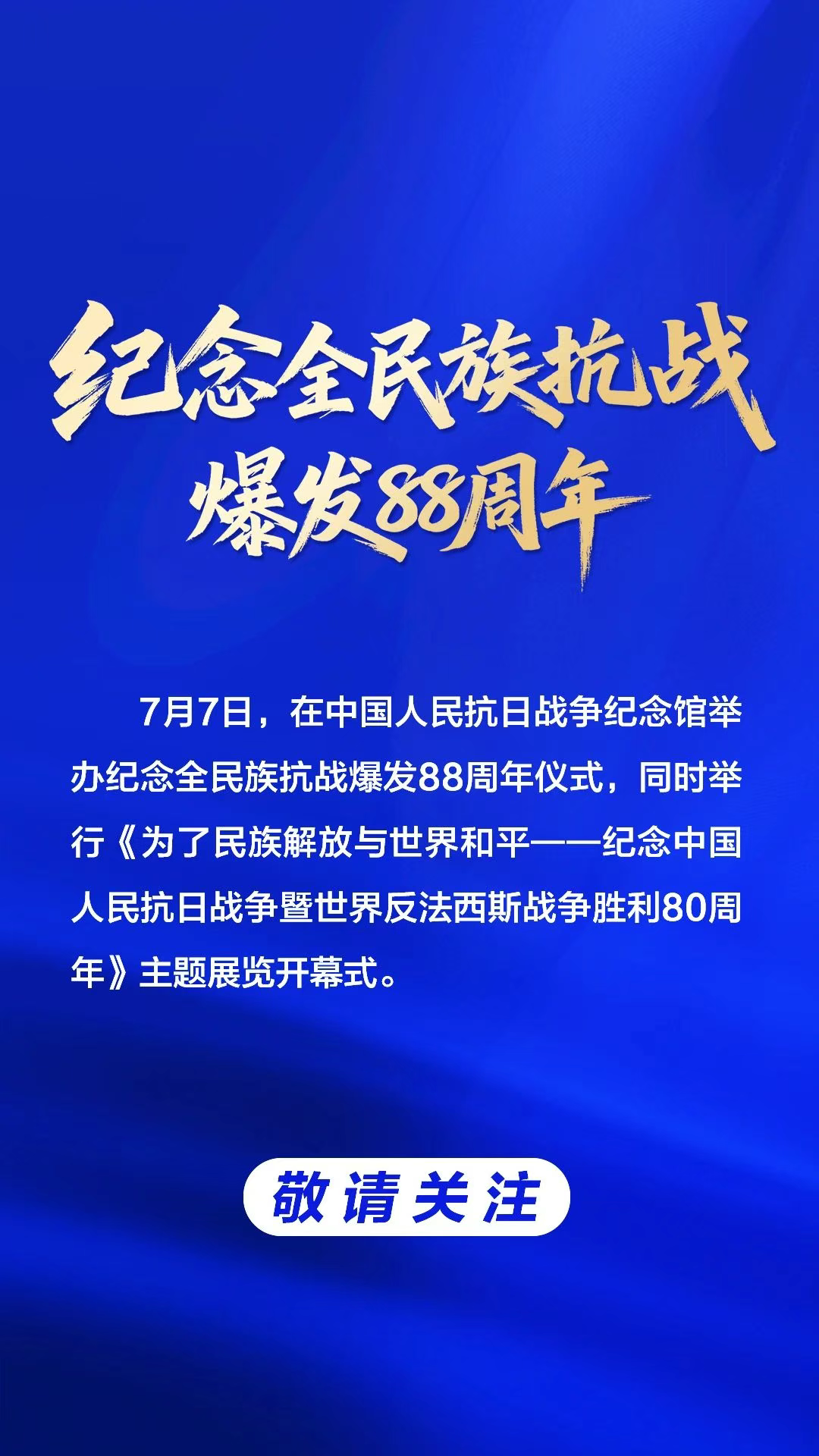 7月7日,在中国人民抗日战争纪念馆举办纪念全民族抗战爆发88周年仪式,同时举行《为了民族解放与世界和平——纪念中国人民抗日战争暨世界反法西斯战争胜利80周年》主题展览开幕式。