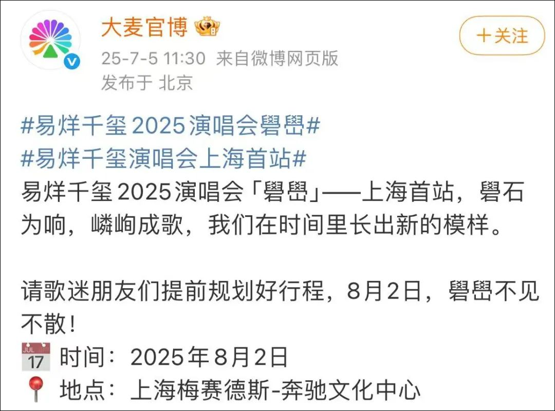 从时间安排上看,7月19日的广州站本可能是易烊千玺演唱会首站。而在7月5日上午,大麦微博官宣了易烊千玺上海首站演唱会。