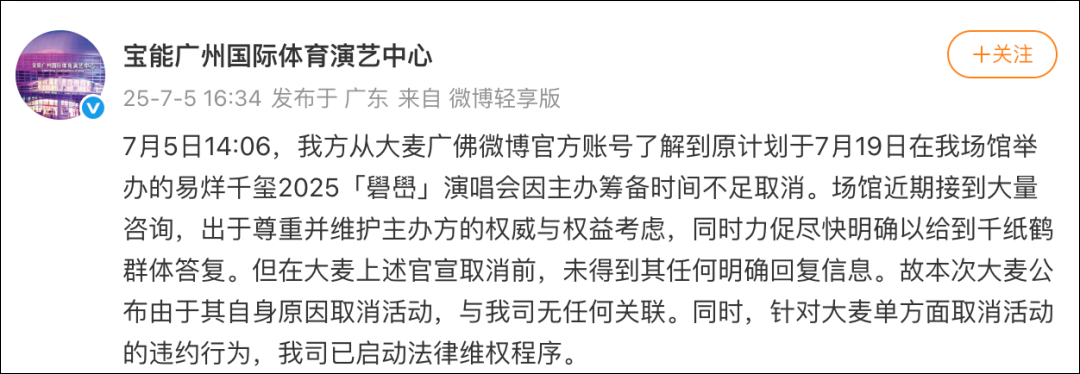 但在大麦上述官宣取消前,未得到其任何明确回复信息。故本次大麦公布由于其自身原因取消活动,与我司无任何关联。同时,针对大麦单方面取消活动的违约行为,我司已启动法律维权程序。”