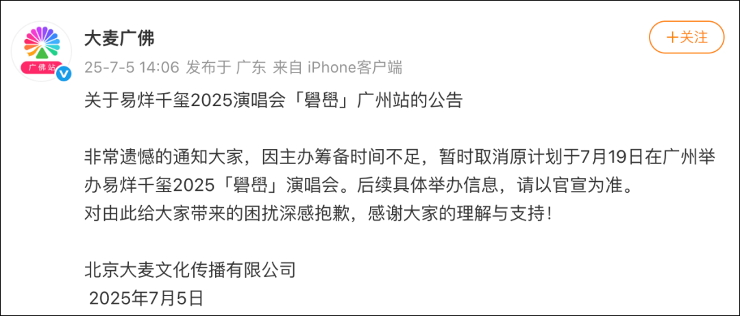 7月5日,北京大麦文化传播有限公司在社交平台上发布公告称,因主办筹备时间不足,暂时取消原计划于7月19日在广州举办易烊千玺2025「礐嶨」演唱会。