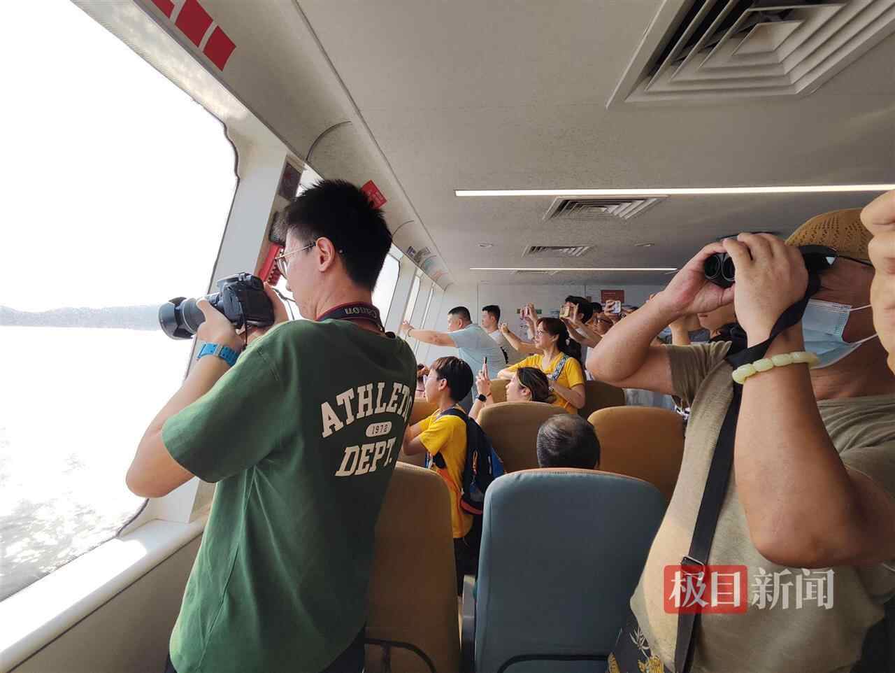 7月6日下午,记者乘坐从中环出发前往马湾的轮渡,行程过半,即可通过窗户看到山东舰以及停泊在其附近的延安舰。船舱里的乘客纷纷拿出手机、相机,凑近窗户拍摄记录。该艘轮渡的船长表示,这两天很多人乘船只为观舰。