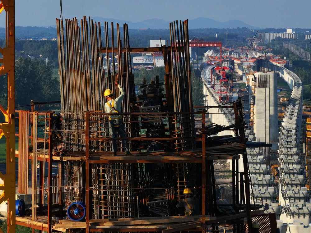 7月3日,中铁上海工程局的工人在宁淮城际铁路(南京至淮安)5标项目跨滁河斜拉桥施工作业(无人机照片)。(新华社记者 李博 摄)