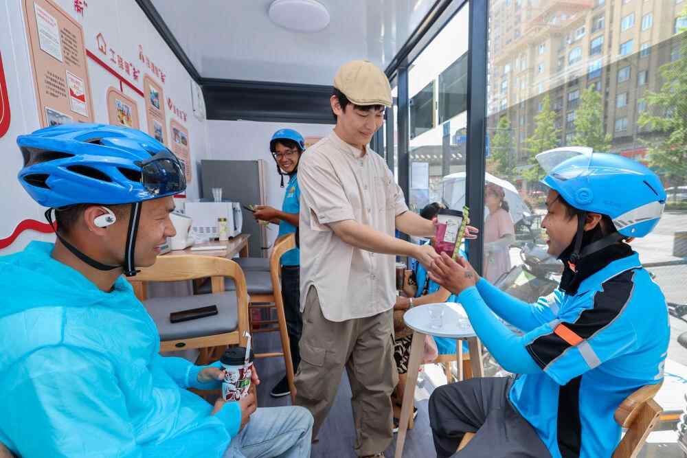 7月2日,在浙江省湖州市德清县总工会设置的工会驿站里,爱心商家为外卖小哥送上冷饮。新华社发(姚海翔摄)