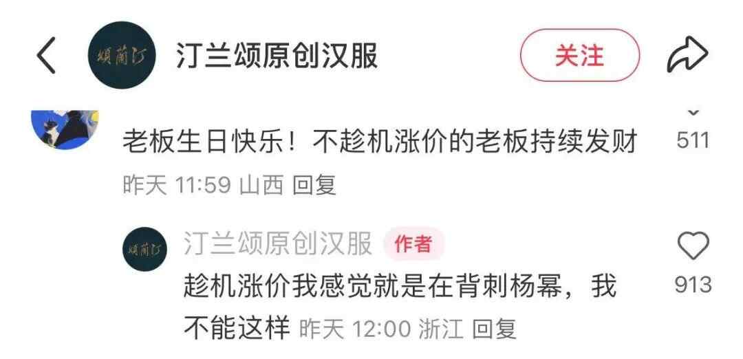 该老板还在评论区回复不涨价话题:“趁机涨价我感觉就是在背刺杨幂,我不能这样。”