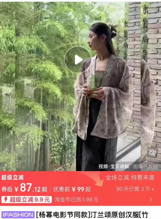 记者搜索店铺页面显示,该款汉服已经标上“杨幂电影节同款”的标签,杨幂所穿的褶衣标价168元,券后148.02元。