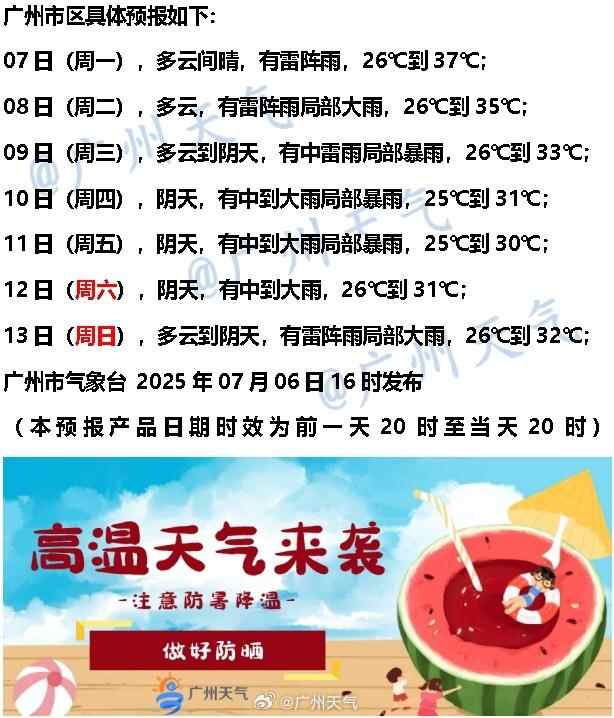 7日,多云间晴,有雷阵雨,26℃到37℃;