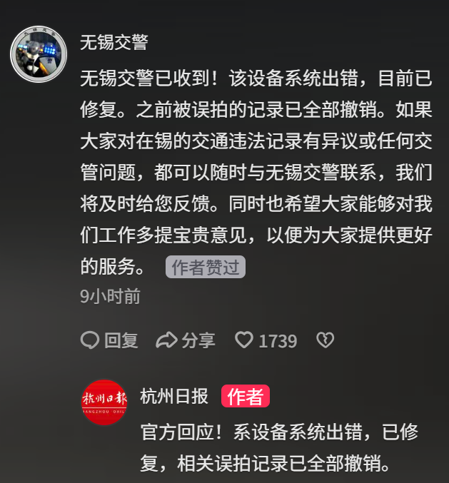 无锡交警在评论区回应称:无锡交警已收到!该设备系统出错,目前已修复。之前被误拍的记录已全部撤销。如果大家对在锡的交通违法记录有异议或任何交管问题,都可以随时与无锡交警联系,我们将及时给您反馈。同时也希望大家能够对我们工作多提宝贵意见,以便为大家提供更好的服务。