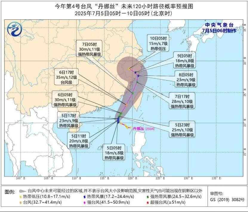 中央气象台预计,7月5日8时至6日8时,南海东部和南部、台湾海峡南部、巴士海峡西部、广东东部沿海、福建南部沿海、台湾岛南部沿海将有7-9级大风,“丹娜丝”中心经过的附近海域风力可达10-12级、阵风13级。预计7月5日8时至6日8时,台湾岛东南部、福建南部和广东东部部分沿海地区将有大雨,台湾岛局地有暴雨至大暴雨(100-180毫米)。