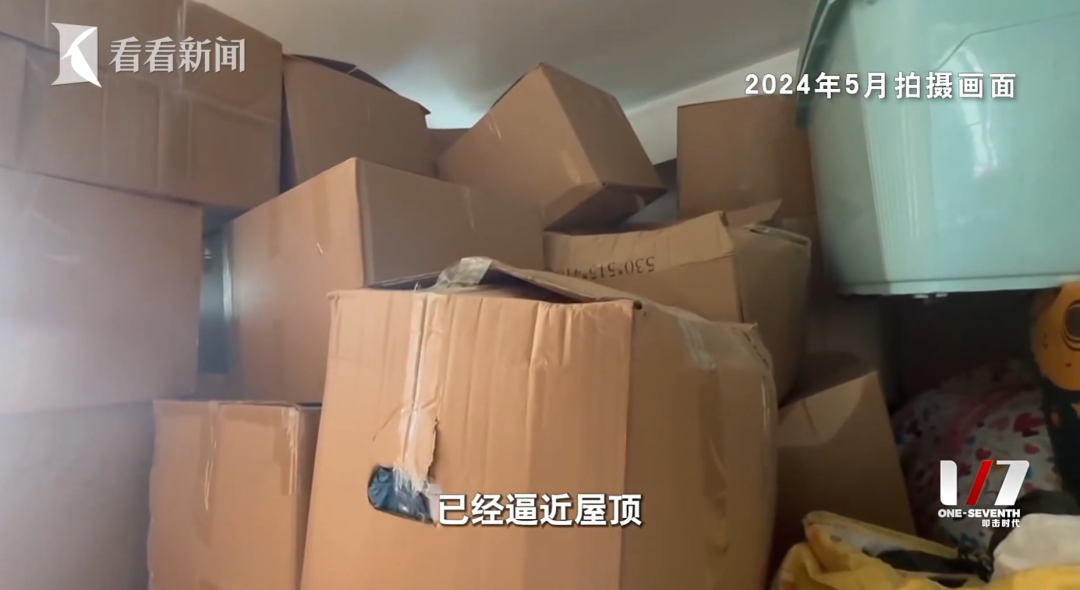 去年5月拍摄的画面,阿姨家快递堆积逼近屋顶,屋内无处落脚,她只能在快递堆里爬动。