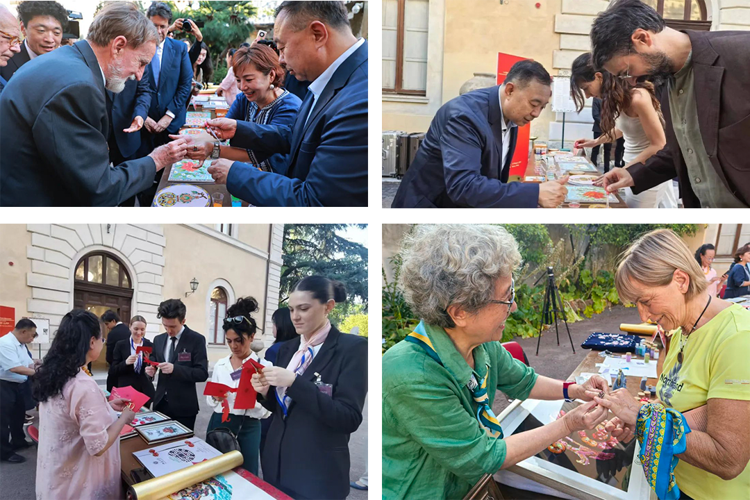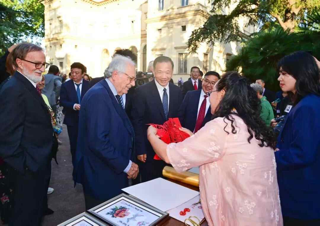作为《非遗里的中国》全球巡展第一站,活动邀请五位中国非遗传承人现场展演。在景泰蓝点蓝《和合双福盘》制作中,意大利嘉宾与中国非遗传承人张颖一起点染雏菊花心釉彩,以中国牡丹与意大利国花雏菊共绘美好图景;蔚县剪纸《罗马斗兽场》,以55只象征和平的飞鸽环绕世界文化遗产罗马斗兽场,纪念中意建交55周年;厦门珠绣传承人谢丽瑜18岁时就为意大利客商设计珠绣拖鞋,她的故事成为中意友好的生动注脚。