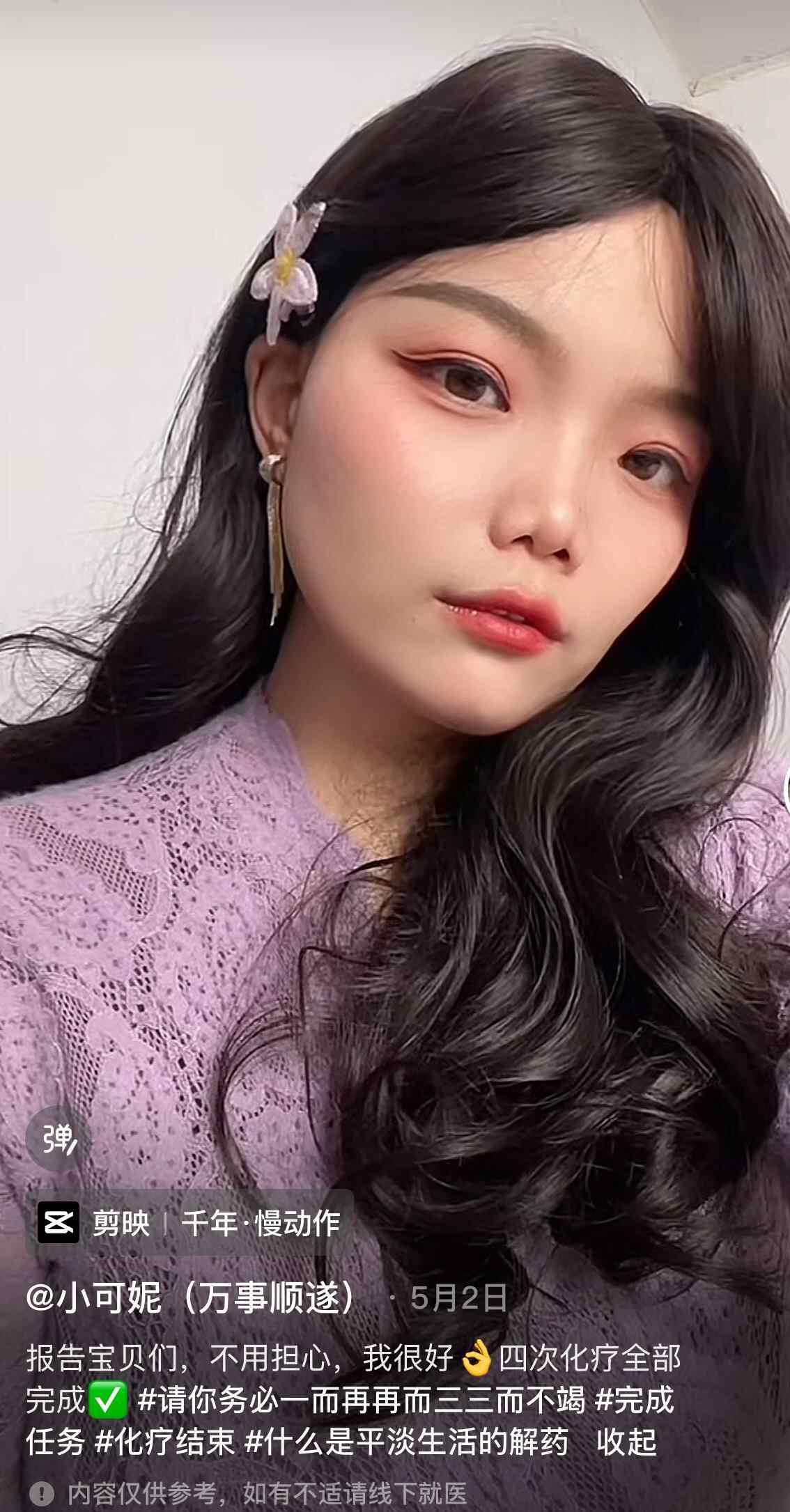 记者注意到,5月2日,“小可妮”发布作品向网友报平安:“不用担心,我很好,四次化疗已经完成。”杨女士告诉记者,其实“小可妮”并不知道自己病情的严重程度。今年四月份,杨女士到医院看望“小可妮”时,才得知其病情。“小可妮”丈夫送杨女士进电梯时透露,“小可妮”癌症查出来时已经是晚期,为了不给她压力,家人当时没告知详情。