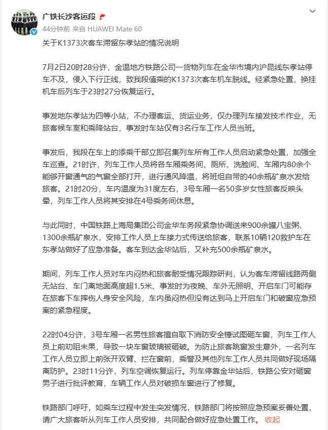 7月5日,@广铁长沙客运段 发布关于K1373次客车滞留东孝站的情况说明:
