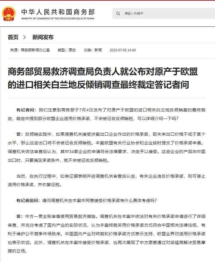 7月5日,商务部贸易救济调查局负责人就公布对原产于欧盟的进口相关白兰地反倾销调查最终裁定答记者问。