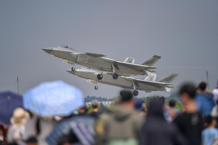 2023年7月26日,在2023年空军航空开放活动长春航空展上,两架歼-20进行飞行展示。新华社记者 张楠 摄