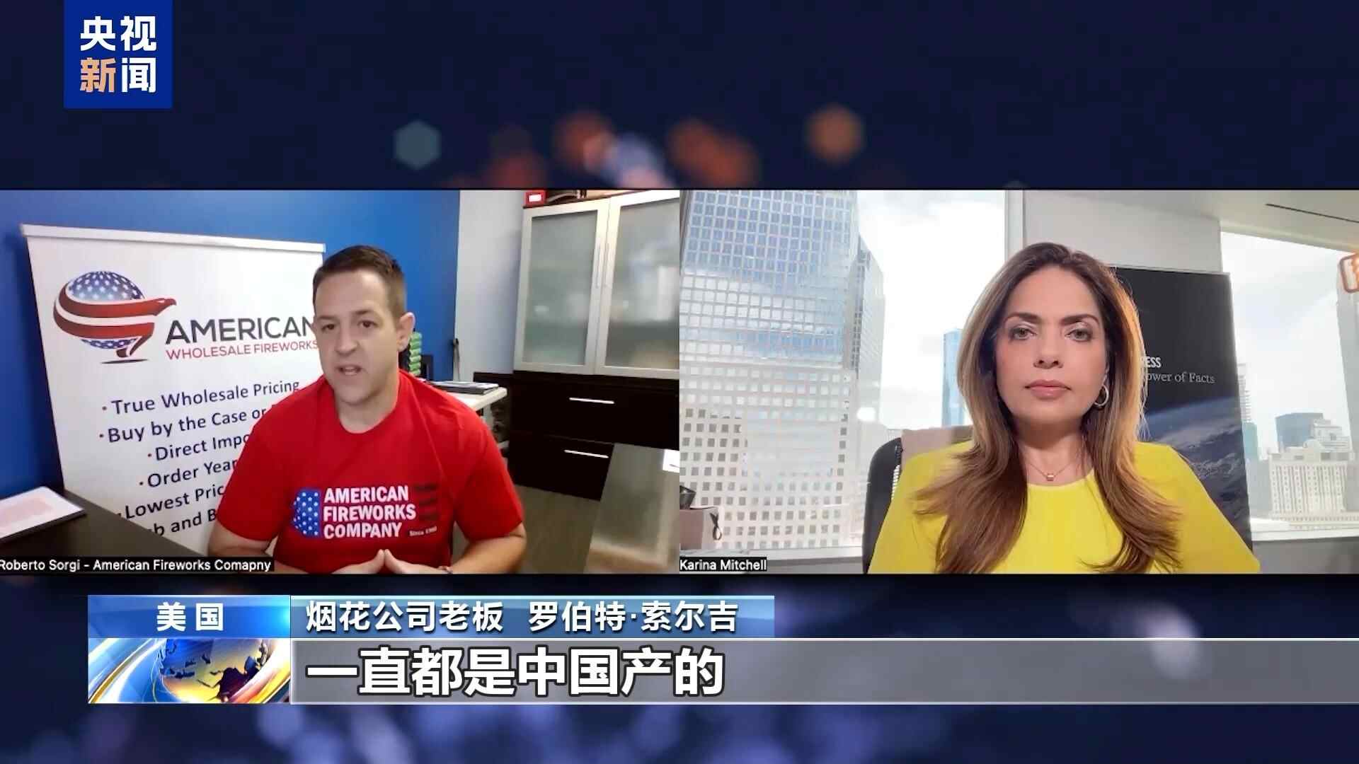 烟花公司老板 罗伯特·索尔吉:烟花产自中国,一直都是中国产的。中国发明了火药,有里面所有的化学成分,中国对此有研究,还有设计师。无论对烟花加征300%还是400%的关税,它们永远不会在美国本土生产,因为我们没有资源。