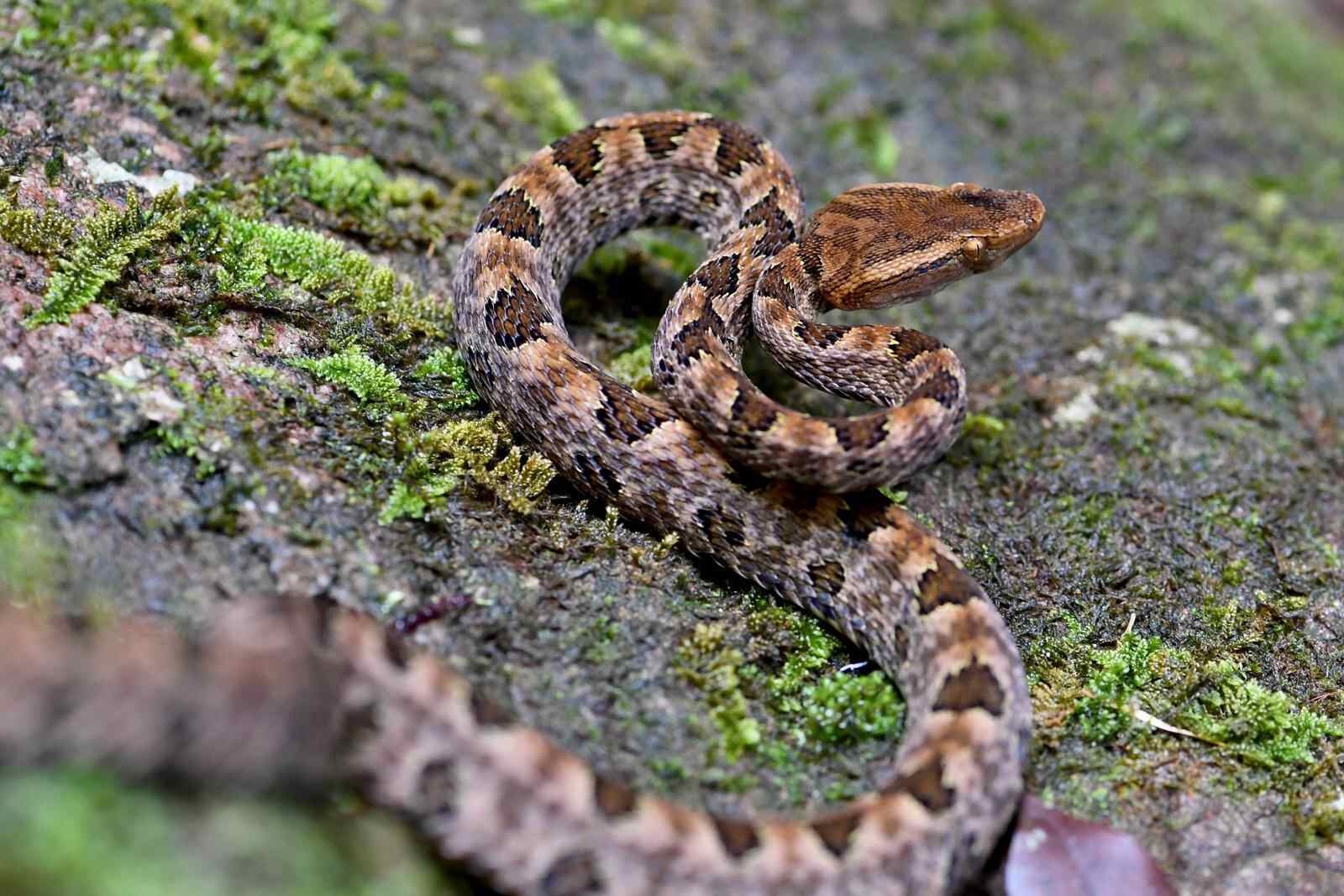 头部多呈三角形,较大,有颊窝,吻尖上翘,蛇身色彩花纹鲜艳,脊鳞扩大呈六角形,尾短而细,前半身可竖立,常主动攻击人和动物。