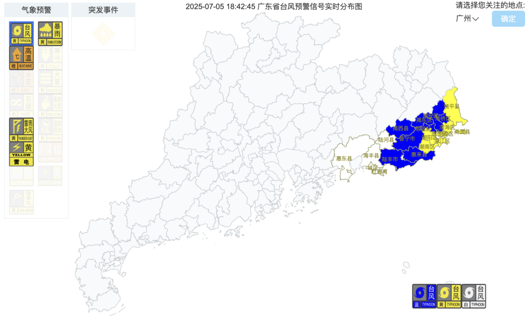 截至7月5日18时42分,广东台风预警信号发布情况 广东气象网截图