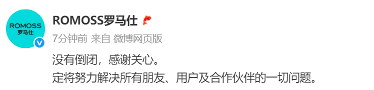 随后,罗马仕发布微博回应:没有倒闭,感谢关心。定将努力解决所有朋友、用户及合作伙伴的一切问题。
