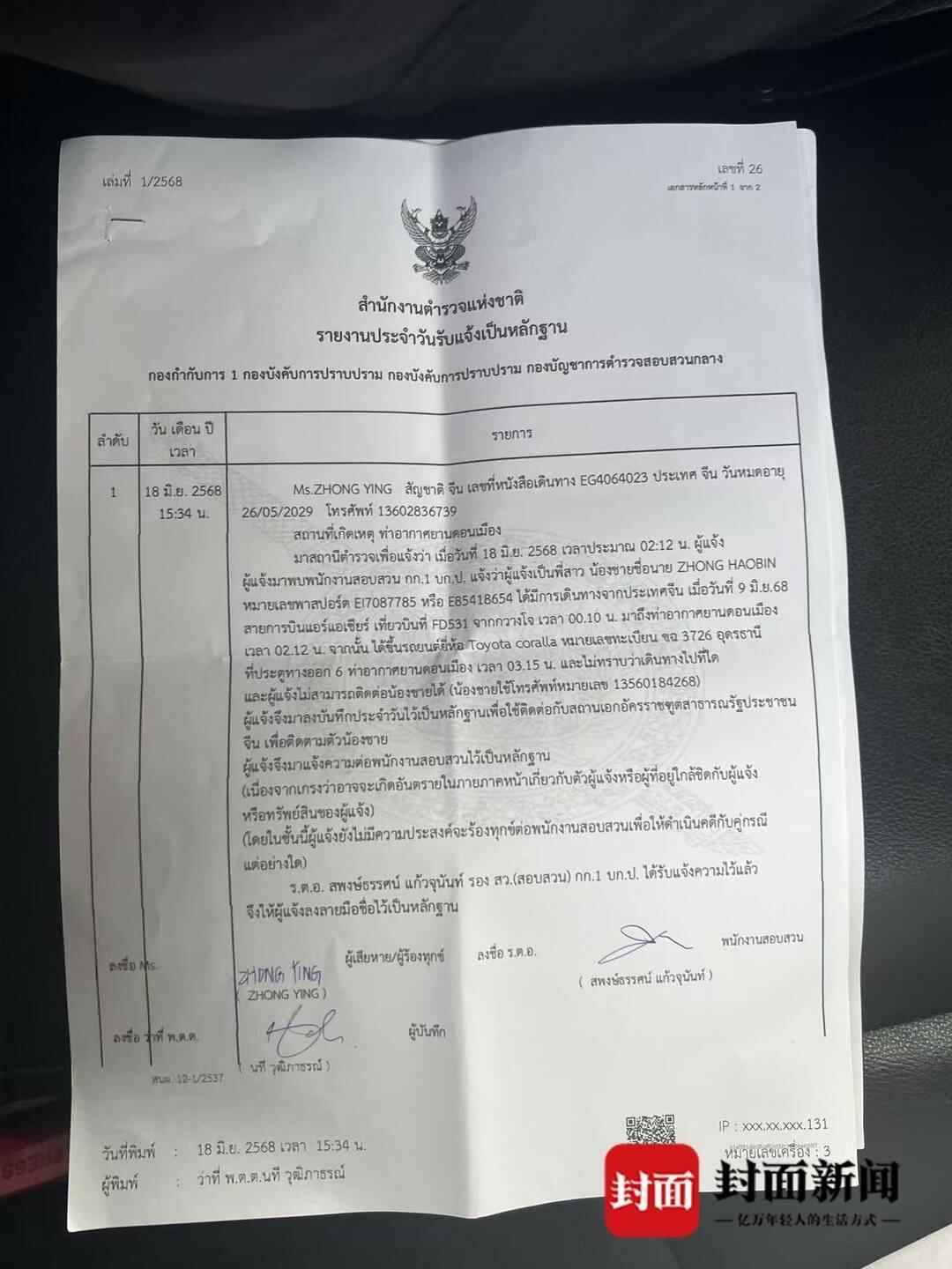 衷女士哽咽地说,她在泰国待了半个月,在当地报警,并向大使馆反映情况。警方调查后发现,弟弟在机场乘坐一辆车离开,后失去踪迹。