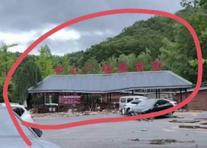 7月3日中午12时许,有网友发视频求助称,自己的弟弟在洛阳白云山景区白云人家酒店入住,于6月30日晚上10时在中心美食广场被洪水冲走,当时连人带车被洪水冲到红色箭头的地方。