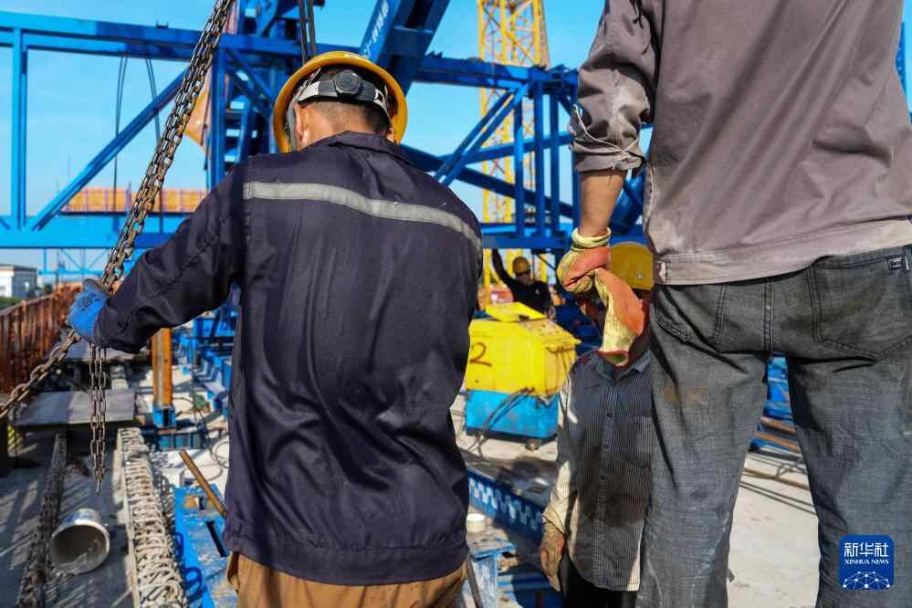 7月3日,中铁上海工程局的工人在宁淮城际铁路(南京至淮安)5标项目跨203县道连续梁施工现场作业。