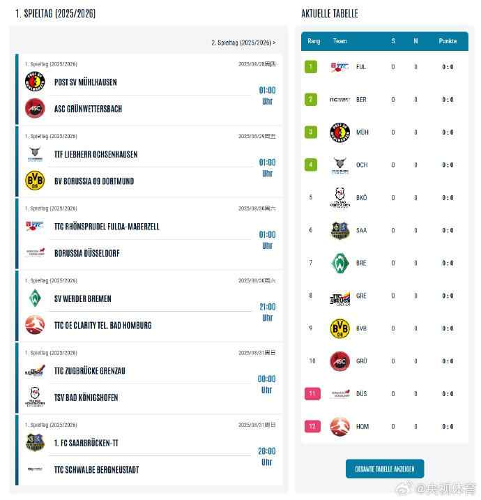 2025-26赛季德国乒乓球甲级联赛赛程正式公布。樊振东效力的萨尔布吕肯俱乐部新赛季首场比赛将于8月31日进行,樊振东有望迎来德甲首秀。