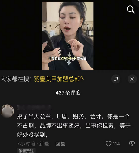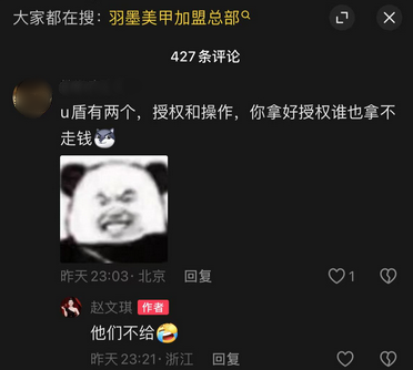 赵文琪还给“搞了半天,公章,U盾,财务,会计,你是一个不占啊,品牌不出事还好,出事你担责,等于好处没捞到”的评论点赞。