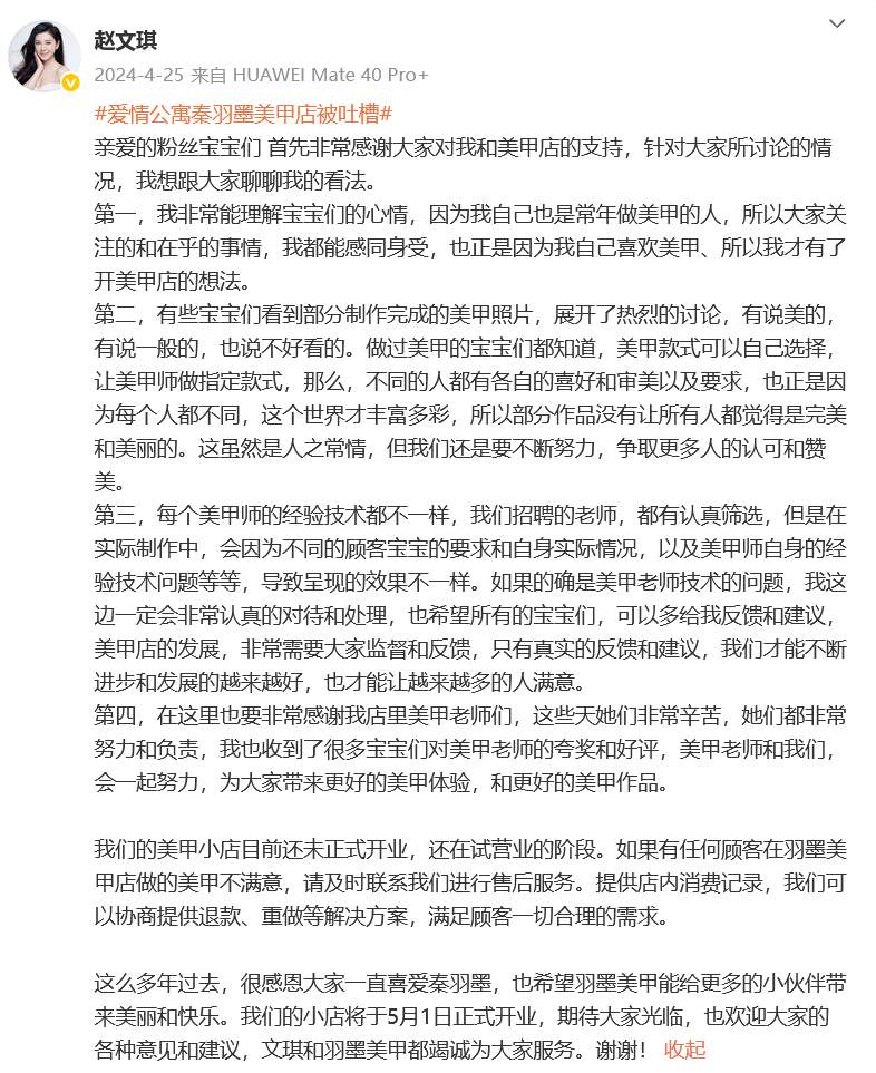 开业不久,该美甲店遭到不少吐槽,赵文琪曾公开回应:“如果有任何顾客在羽墨美甲店做的美甲不满意,请及时联系我们进行售后服务。提供店内消费记录,我们可以协商提供退款、重做等解决方案,满足顾客一切合理的需求。”