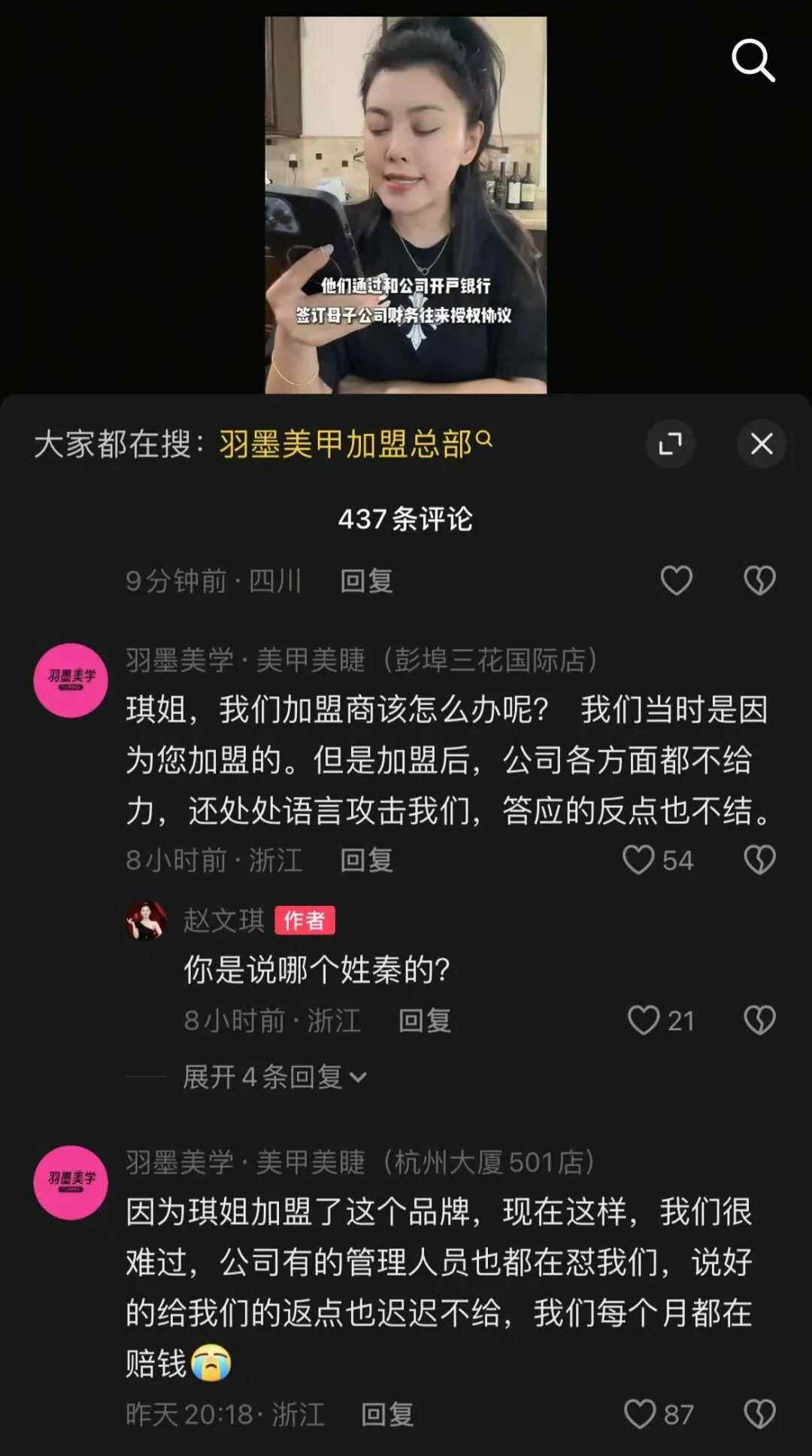 赵文琪发视频后,数位加盟商在其评论区留言维权“我们加盟商怎么办”,声称“我们每个月都在赔钱”。