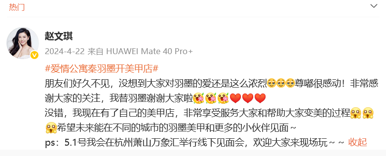 2024年4月,赵文琪发文官宣自己开美甲店了,店名就叫“羽墨美甲” 。“我现在有了自己的美甲店,非常享受服务大家和帮助大家变美的过程,希望未来能在不同的城市的羽墨美甲和更多的小伙伴见面~”