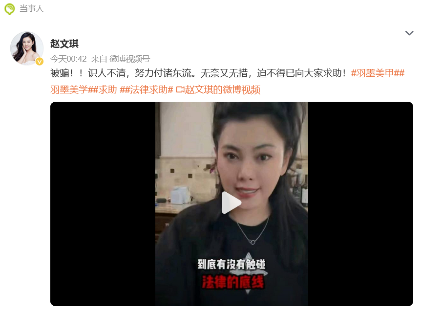 7月3日,曾在《爱情公寓》中饰演“秦羽墨”的女演员赵文琪发视频自曝被合伙人欺骗利用:“被骗!识人不清,努力付诸东流。无奈又无措,迫不得已向大家求助。”