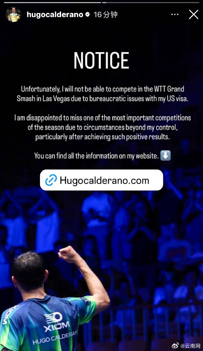 据北青体育,世界排名第三的巴西乒乓球选手雨果-卡尔德拉诺发文,确认因签证问题无法前往美国参加WTT美国大满贯比赛。