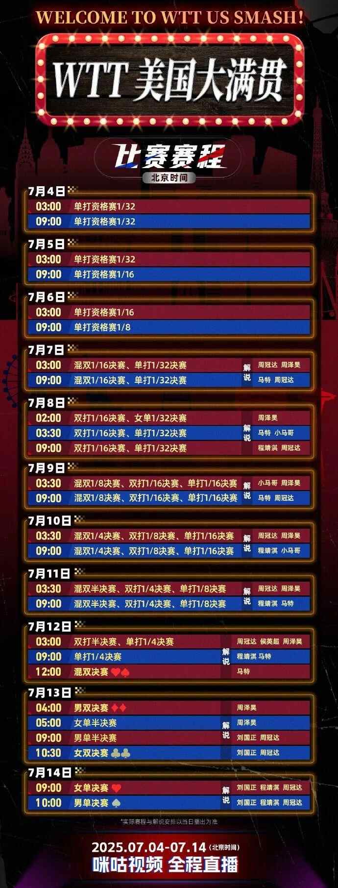 WTT美国大满贯于7月3日至13日在拉斯维加斯奥尔良体育馆举行,全球顶尖运动员将争夺2000点的世界排名积分。