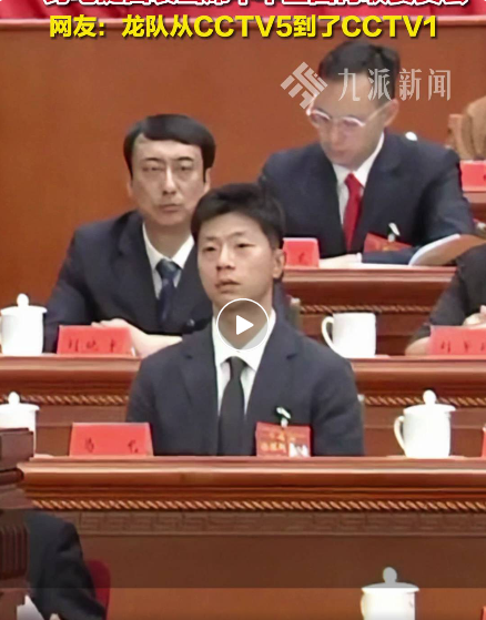 马龙身穿一身笔挺西装,面容严肃。不少网友感叹:“龙队从CCTV5到了CCTV1。”