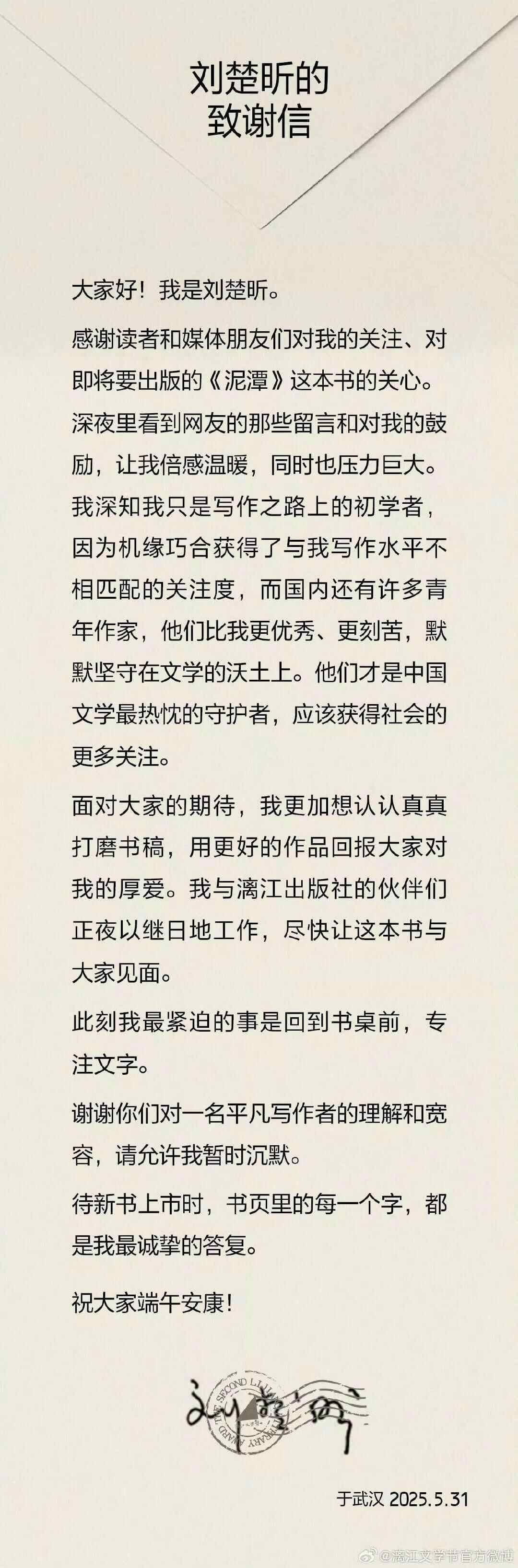 在网络爆火后,刘楚昕于5月31日通过漓江出版社官方平台回应各方关切:“此刻我最紧迫的事是回到书桌前,专注文字。谢谢你们对于一名平凡写作者的理解和宽容,请允许我暂时沉默。待新书上市时,书页里的每一个字,都是我最诚挚的答复。”